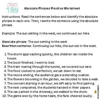 An absolute phrase combines a noun and a participle. Free interactive exercises to practice online or download as pdf to print. Modifiers and/or objects may be present to complete the thought.