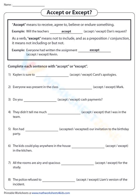 Accept Except Worksheet. Accept and except are frequently confused, but they are totally different words. Sometimes it’s difficult to accept the.